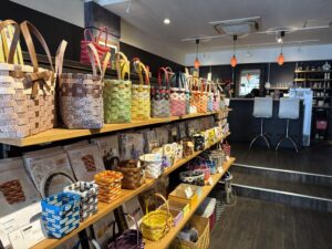 奥はゆったり過ごせるカフェスペース、手前には紙バンド制作のワークスペースや作品販売コーナーがあり、楽しい空間が広がっていて、癒されます😌🌿