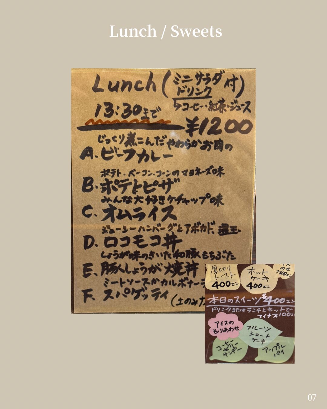ちなみにメニューは、ランチタイムには、オムライス、ロコモコ丼のほかにも、ビーフカレーやポテトピザ、生姜焼きなどがあり、すべてサラダ・ドリンク付きで1,200円という嬉しいお得感もありました✨