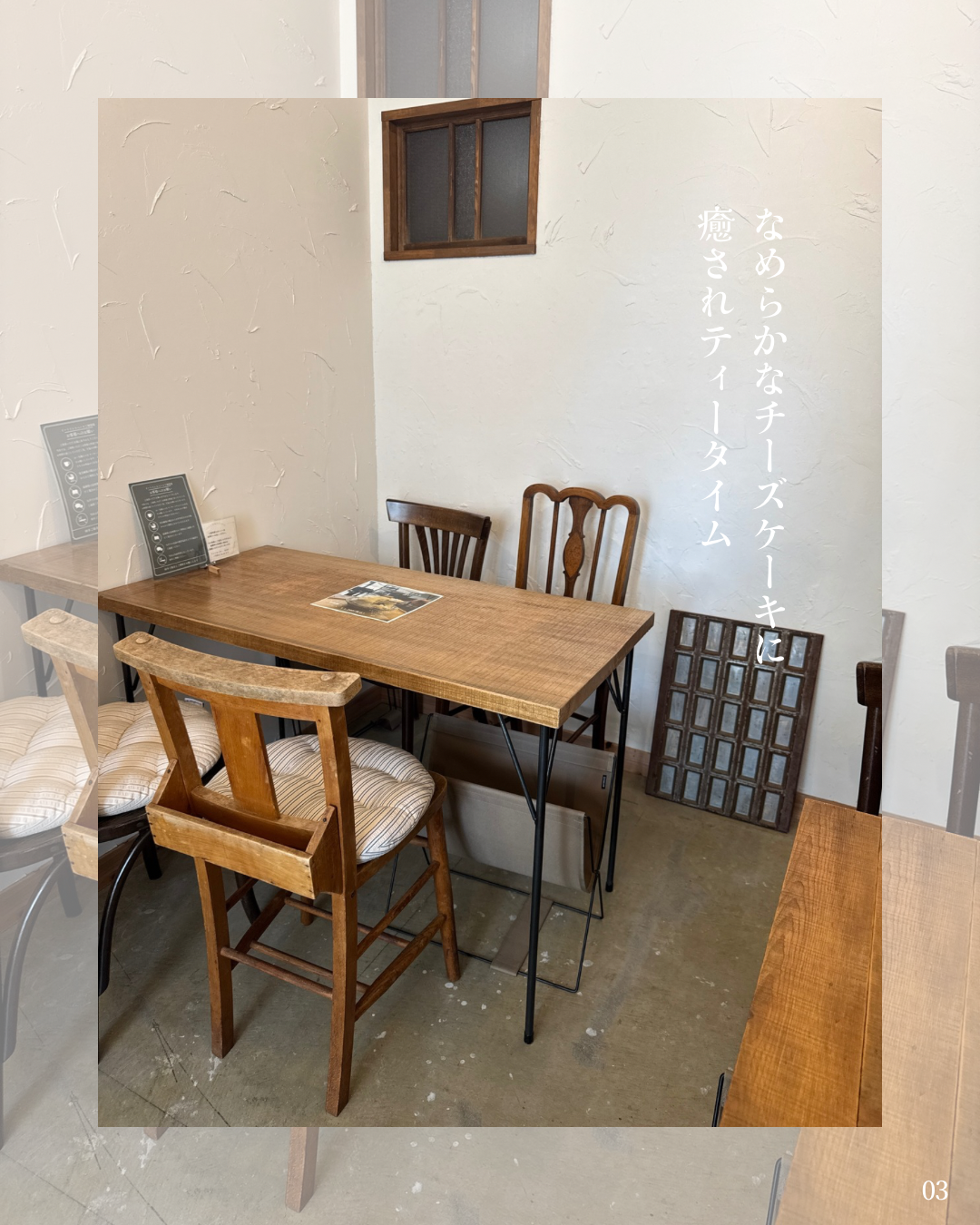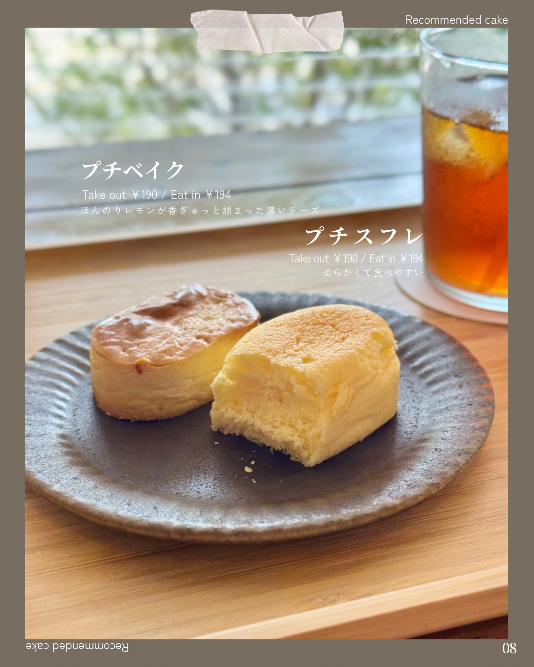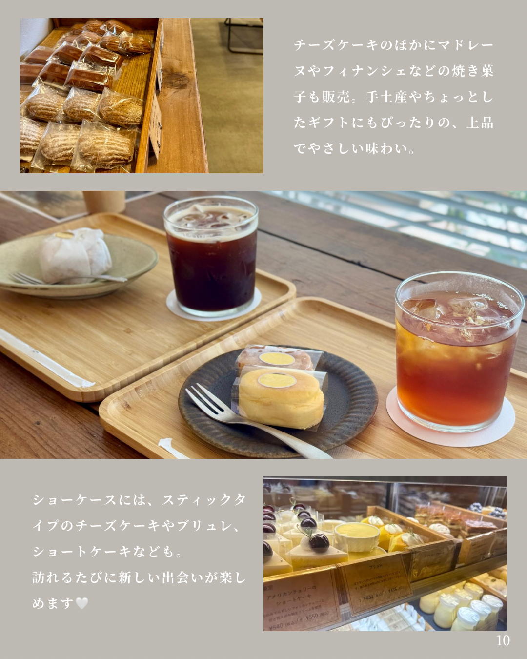 種類豊富なチーズケーキと季節限定スイーツが揃い、カフェタイムも楽しく、心地よい時間を過ごせます。