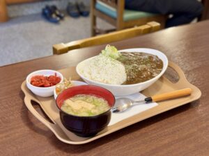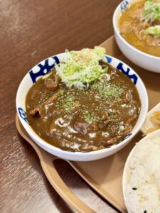 👉 スパイシーな香りが食欲をそそるカレーライス。追加で、ガラムマサラの粉をかけていただきました。モツの旨みがしっかり染み込み、スパイシーさもありながらちょっと甘めな味付けも食べやすかったです。ご飯も盛り盛りなボリューム満点の一皿でした。