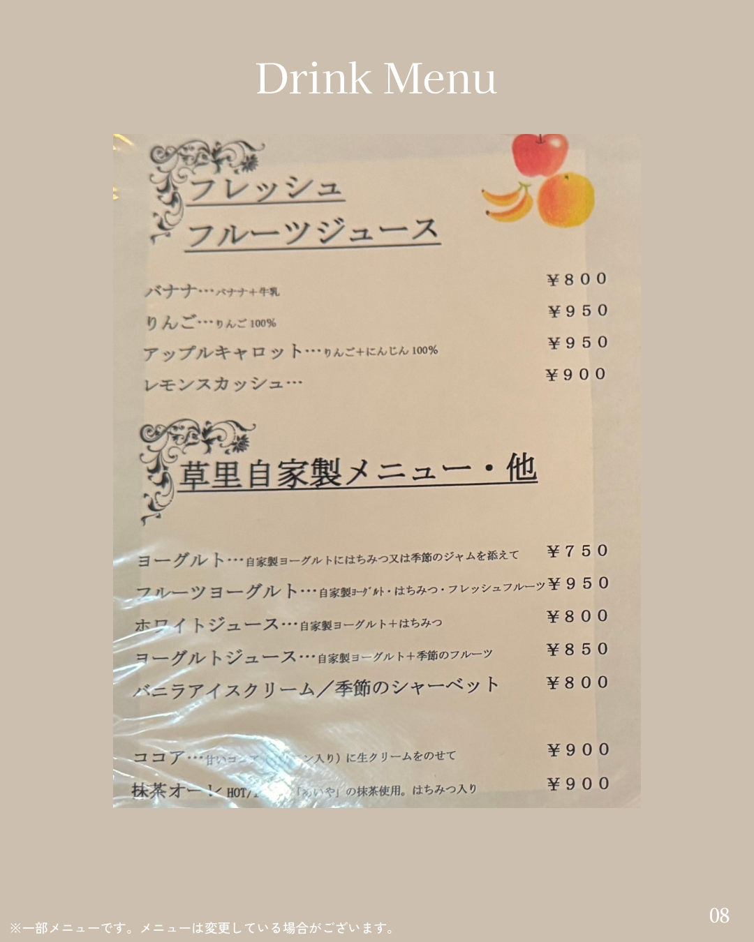ちなみにケーキ以外にも、ちょっとした軽食や、自家製ヨーグルトやアイス、生果汁ジュースもあるので、甘さ控えめが好みの方にも安心です。