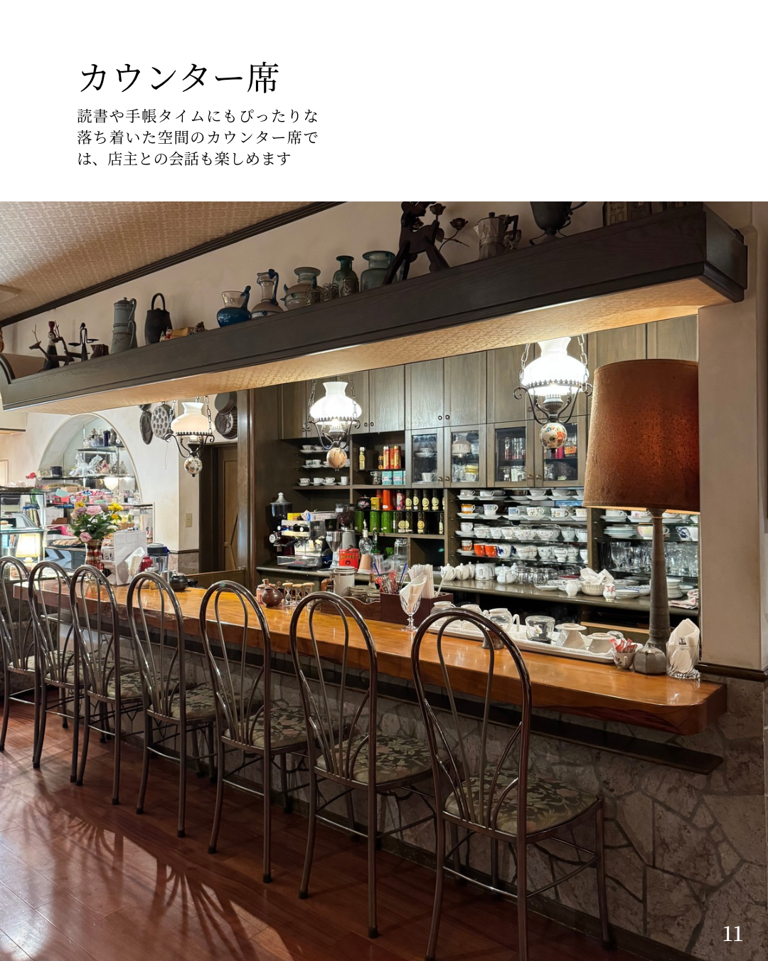 店内は落ち着いた照明とアンティーク家具で統一され、ゆったりとした時間が流れる空間。