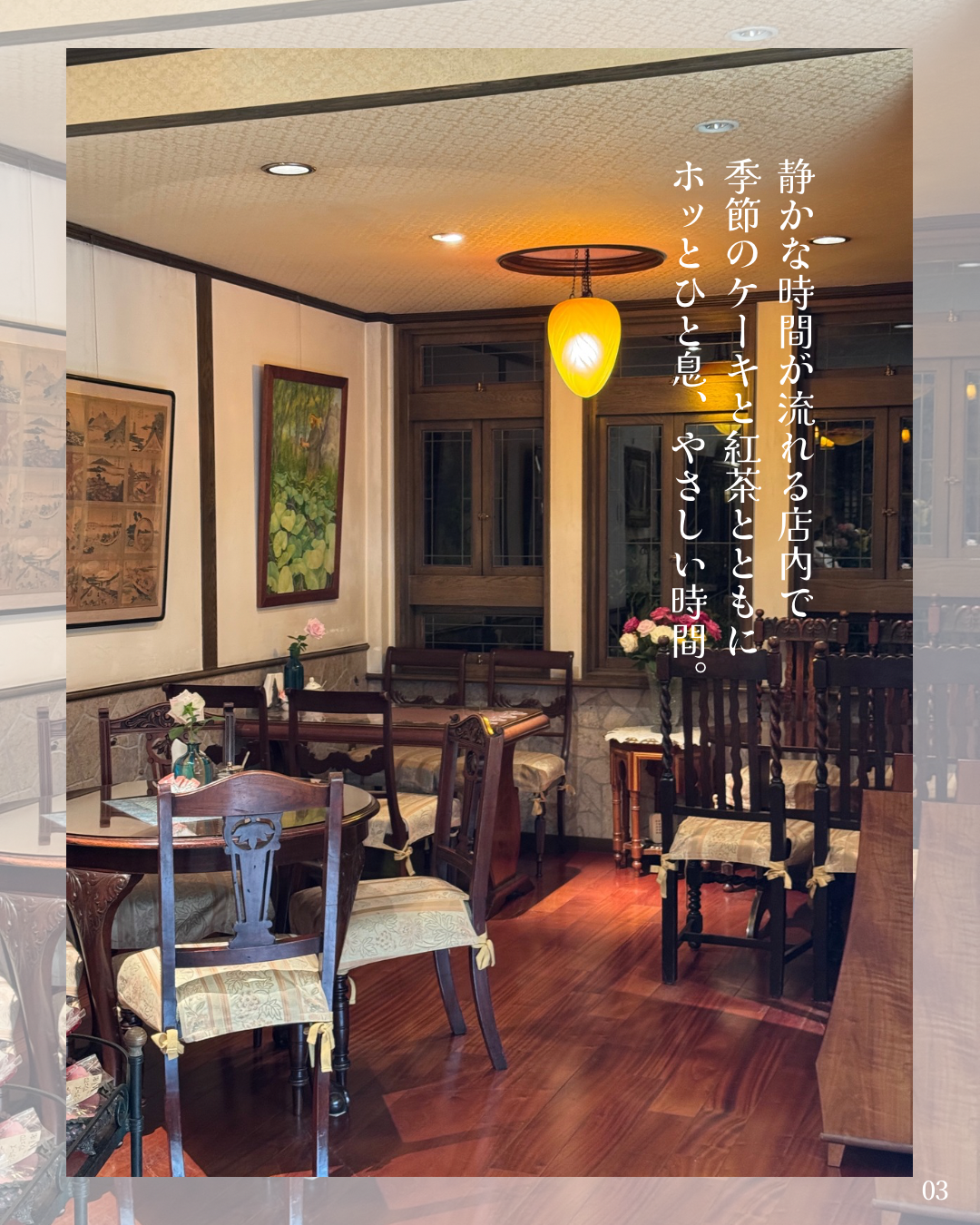 静かな時間が流れるアンティークな空間で、美味しいケーキと紅茶を楽しみながら、心ほぐれるひとときを過ごしてみてください✨